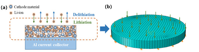 图1 (a)正极材料锂离子嵌入/脱出过程示意图 (b)锂化阶段模型施加载荷和边界条件