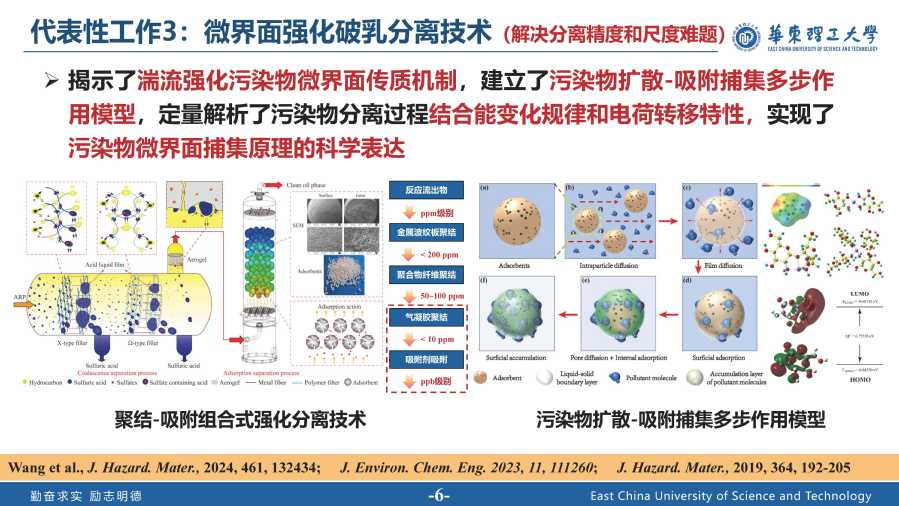坚持面向科技前沿和国家重大需求,长期致力于非均相体系多维度、跨尺度、多物理场耦合的强化分离理论、技术和装备研发。先后入选上海市“超级博士后”人才激励计划(2019)、上海市青年科技英才扬帆计划(2020)。主持国家自然科学基金面上及青年项目、科技部国家重点研发计划(子课题)、国防科工局基础产品创新科研项目(课题)、中国博士后科学基金特别资助等国家级及省部级项目,以及中石油、中石化等企业委托的技术开发项目。迄今已发表学术论文近50篇,其中SCI收录40余篇,总影响因子300+,他引1000余次,包含Chemical Society Reviews 、Chemical Engineering Journal 、Journal of Hazardous Materials 等化学工程、环境工程、分离工程领域顶级期刊,1篇入选第五届中国科协优秀科技论文(全国共97篇,化学工程学科仅此1篇);申请中国发明专利22件,已授权18件,完成专利转化2件