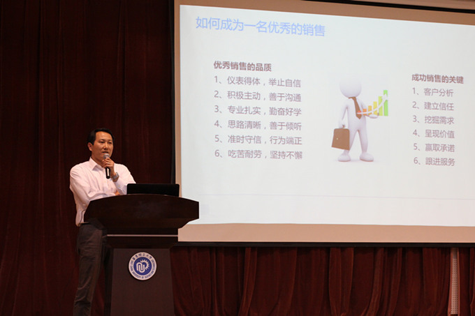 赵春明分享了自己从一名技术男成为一名顶尖销售,并晋升为公司销售经理的成长历程,介绍了技术销售岗位应当具备的思维和品质。他还介绍了自己带领的一个暑期实习项目,希望同学们通过企业平台增长见识和本领,为进一步就业和职场发展做好准备。