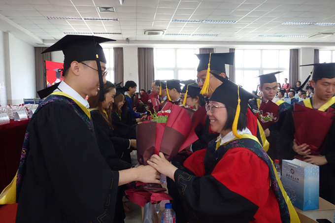 毕业生代表向学院老师献上最美丽的鲜花,为他们的辛勤培育和谆谆教诲表示最衷心的感谢。全体员工宣读了毕业誓言《青春之歌》,共同宣誓:让青春在为祖国、为人民、为民族、为人类的奉献中焕发出更加绚丽的先彩。