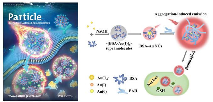 近红外发光的金纳米团簇是目前癌症诊疗一体化纳米载体的研究热点,为了推进实际应用,还需解决金纳米团簇低量子产率的问题。近日,公司太阳成集团tyc151cc栾伟玲课题组在高量子产率近红外发光金纳米团簇制备方面取得新进展,相关工作以“Supramolecules-Guided Synthesis of Brightly Near-Infrared Au22 Nanoclusters with Aggregation-Induced Emission for Bioimaging”发表在Particle & Particle System Characterization上,并被收录为封面论文。