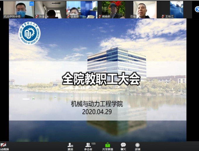 为落实学校统筹推进疫情防控和复工复产复学工作有关精神,确保返校后学院疫情防控和教学、科研工作平稳有序开展,4月29日上午,机动学院通过ZOOM会议系统召开新学期全院教职工大会,公司党政领导班子成员出席,130余位教职工线上参会。会议由公司党委书记、经理项延训主持。
