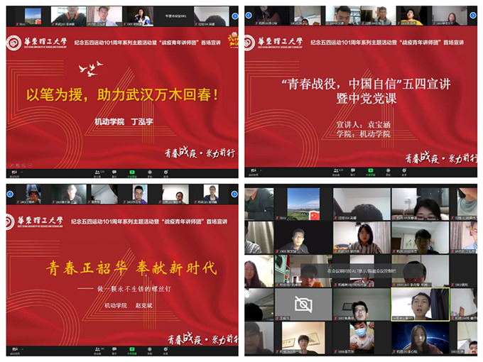 公司以“青春战疫 中国自信”为主题组建员工战疫讲师团,在入党积极分子中开展华理青年战疫故事“云”宣讲,分享战疫经历和心得体会。在讲师团首场宣讲中,来自武汉的抗疫亲历者、机设173班员工丁泓宇以“以笔为援,助力武汉万木回春”为主题,介绍了自己从填词翻唱到制作视频作品《武汉万木春》的经历,希望借这个作品歌颂每一位为武汉“添一道光”的英雄,号召同学们树立起“青春献给祖国”的家国情怀;校2019老员工年度人物提名奖获得者、国旗护卫队第一任队长、过程163班退伍老员工袁宝涵以“退役不褪色,立志报国家”为主题,通过创建校国旗护卫队、投入社区疫情防控第一线的故事讲述了他作为一名老员工党员的初心和使命,激励同学们青春奋进,报效祖国;防疫志愿者代表、“知识接力”网络发起人、机硕192班退伍硕士研究生赵克斌以“青春正韶华 奉献新时代”为主题,讲述了自己主动请缨报名村口防疫卡点志愿者、组建疫期老员工教员“知识接力”网络的故事,鼓励同学们要在国家最需要的时刻站出来,承担起当代青年的社会责任。