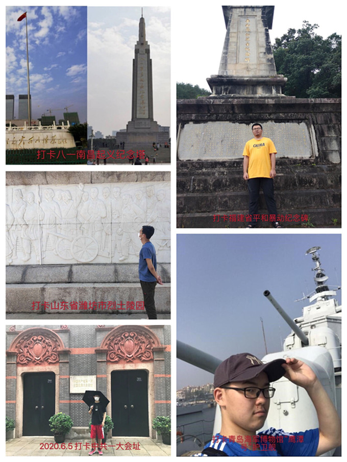 来自上海的机械类1901班明岳伟来到中共一大会址纪念馆,经典的石库门老建筑,青红交错的砖墙,一扇一扇挂着铜环的黑漆大门,让他体会到那个风雨如磐的年代,中国共产党人波澜壮阔的奋斗历程,在实践中进一步增强了对马克思主义的信仰;来自福建的材控181班陈一航参观了平和暴动烈士纪念碑,发现了很多与他同姓的革命烈士的石碑,深深感受到从革命先烈身上继承的热血正在自己的身上流淌;来自山东的过程171班曲逸凡来到潍坊革命烈士陵园,瞻仰了烈士纪念碑,学习了家乡先烈的革命事迹,深切感受到他们为了革命事业甘于牺牲的大无畏精神;来自浙江的过程171班乐祺中利用假期参观了青岛海军博物馆,他来到军舰上认真学习了党领导下的军队发展历史,认为青年员工应始终铭记中国曾经任人欺凌的历史,发奋读书,报效祖国。