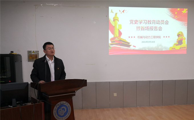 为深入学习贯彻习近平总书记在党史学习教育动员大会上的重要讲话精神,按照学校部署安排,3月16日下午,机动学院在徐汇校区实验10楼301室召开党史学习教育动员会暨首场报告会。马克思主义公司党委副书记、副经理邱卫东副教授受邀作了题为“讲好百年来中国共产党推进社会主义的故事”专题辅导报告,机动学院全体教职工参加。报告会由机动公司党委书记杨强主持。