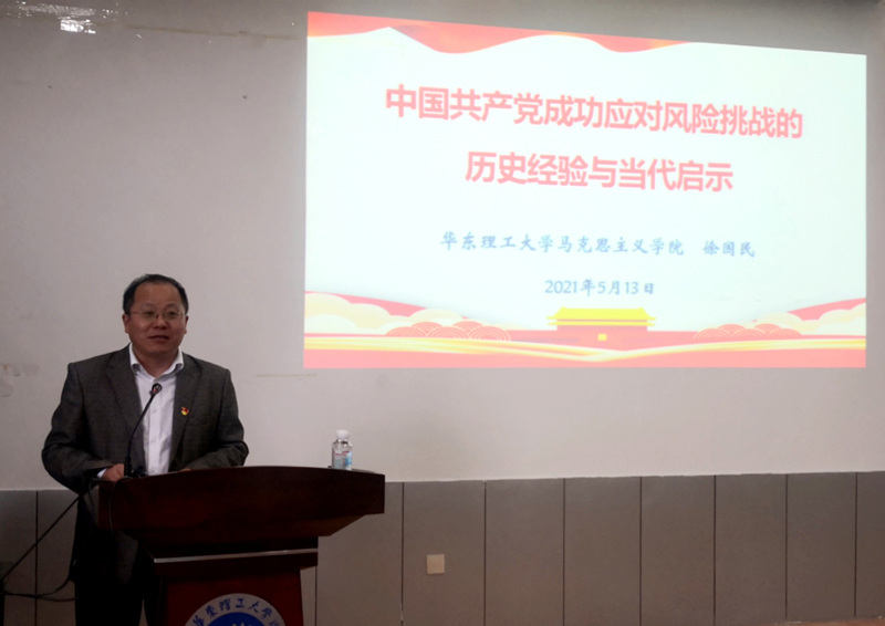 徐国民从应对重大风险挑战的百年历程、主要启示、现实困境和总体要求四方面介绍了中国共产党的百年奋斗历程和伟大成就。他用丰富的史料展现了中国共产党自成立以来在应对大革命失败、全面内战、金融危机、非典以及汶川特大地震等种种风险挑战中,以超乎寻常的胆略、毅力、智慧化解各种危局和困境的伟大历程。他指出,当前在政治、意识形态、经济、科技、社会和党的建设等领域我们仍面临重大风险,要从坚持人民立场、增强忧患意识、掌握思维方法、把握基本规律和提升能力素质等方面不断提高防范化解重大风险的能力。