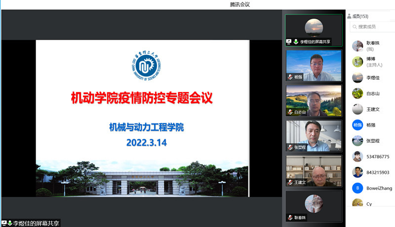 为落实学校统筹推进疫情防控工作有关精神,确保学院疫情防控和教学、员工工作、科研、实验室安全工作平稳有序开展,3月14日上午,机动学院通过腾讯会议召开学院教职工大会,机动公司党委书记杨强,经理张显程,副书记李煜佳,副经理易建军、白志山、陈建钧及全体教职工共153人参会。会议由杨强主持。