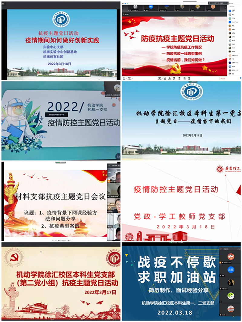 公司实验中心党支部老师联合创新基地和机械创客社团36位骨干员工,线上指导员工如何在疫情期间做好创新实践活动,做到“疫情防控不放松,创新实践不断线”;材料党支部老师就关于如何提升网络教学水平、保证员工线上学习效果展开充分交流与研讨,保驾护航云教学;党政-学工教师党支部学习了李喜娜和黄泽炀等教师连续在校内参与一线抗疫工作、倾情服务师生、践行党员使命担当的精神;化工机械第一支部从服务于员工的角度出发,重点强调了疫情下导师做好与员工沟通工作的重要性,在做好疫情防控的同时做好重点员工的心理健康教育工作;徐汇校区本科生党支部通过分享求职、学习科研、运动生活等经验体会,减轻焦虑,并面向所有毕业班同学开展“战疫不停歇,求职加油站”交流会活动,通过辅导员、已签约同学分享制作简历、面试技巧等经验交流,助力大四同学求职就业。在疫情防控关键时期,本次疫情防控主题党日活动发挥了党支部的核心战斗堡垒作用,进一步彰显了党员的责任担当和无私奉献精神。