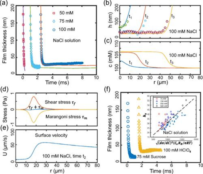刘博特聘副研究员采用自研仪器,创新地观测到了气泡靠近过程中所形成微纳米液膜的动态薄化过程,电解质溶液中气泡呈现出一个与清水截然不同的两阶段合并:起初气泡靠近规律和纯水中相似,但当距离减小到大约40纳米(nm)时,接近表面的“前缘”就会因某种排斥力而变平。结合实验观测及理论建模,作者提出了一种纳米尺度溶质输运理论模型,在不引入任何拟合参数的前提下解释了这种特殊的‘两段式’液膜薄化过程。