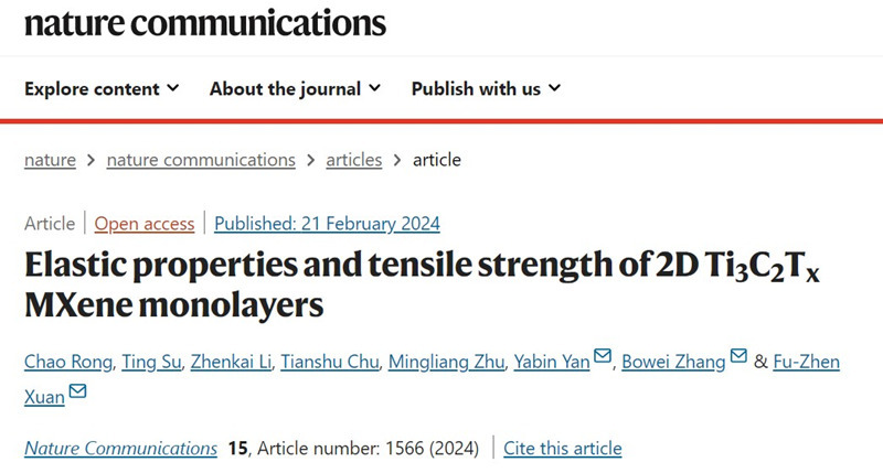 近日,公司太阳成集团tyc151cc张博威等在Nature Communications 上发表了题为 “Elastic properties and tensile strength of 2D Ti3C2Tx MXene monolayers” 的研究论文,在线报道了该课题组在Ti3C2Tx基柔性传感材料结构强度领域的研究进展,提出一种可靠、直接、定量的方法来测量单层Ti3C2Tx纳米片的力学性能。