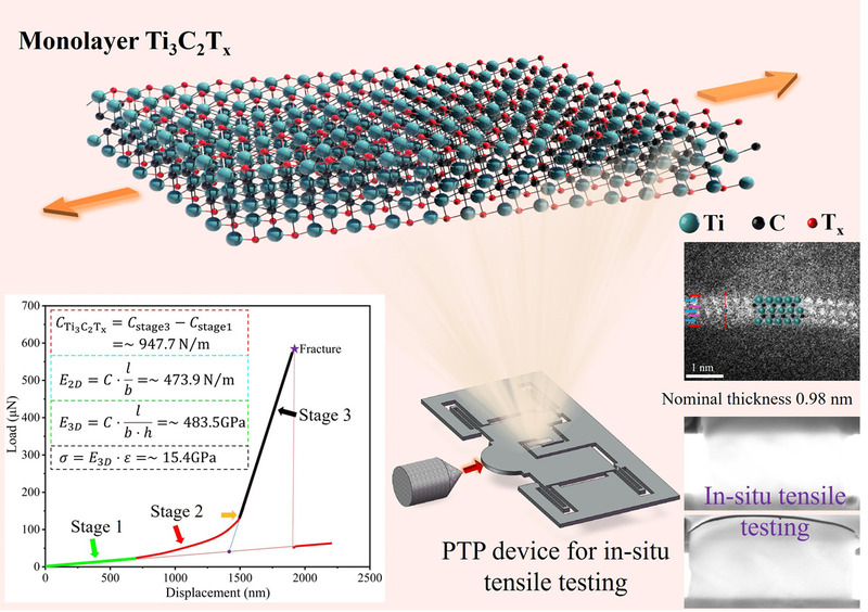 图片说明:利用PTP装置实现对单层Ti3C2Tx纳米片的原位拉伸测试