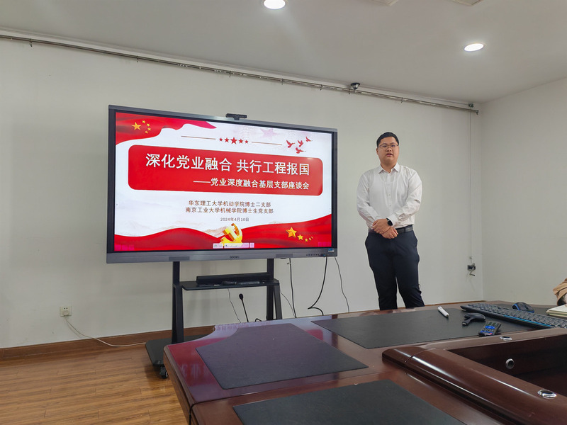 公司机动学院博士第二党支部书记聂文睿汇报了本支部全国高校“百个研究生样板党支部”建设情况,介绍了理论知识学习型、国家需求攻坚型、工程安全服务型和管理精细化的“三型一化”工作模式,就工程需求为导向的产学研用深度融合进行了汇报。南京工业大学机械学院博士生党支部副书记刘连华介绍了支部情况与年度工作进展。