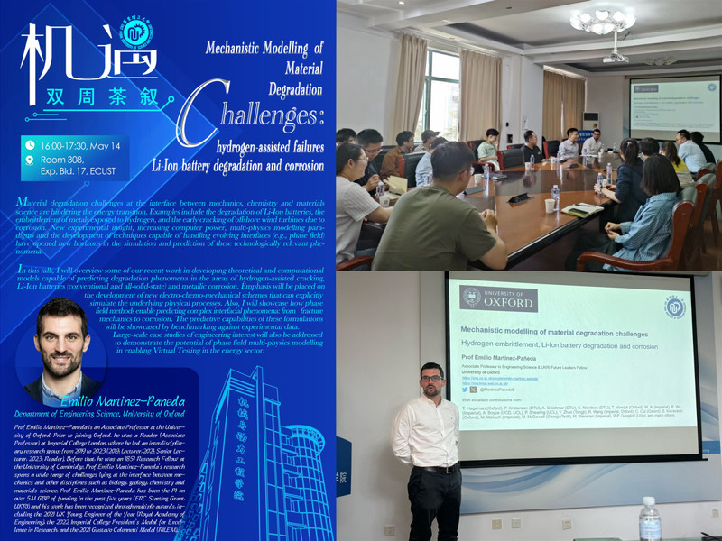 Martínez-Pañeda教授的报告面向氢致失效、锂电池降解、金属腐蚀等国际前沿课题,其借助相场方法对复杂的材料与结构失效进行预测,并通过与大量试验数据对比验证了相场模拟方法的预测能力。学术报告结束后,Martínez-Pañeda教授与现场师生进行了热烈的讨论与深入的交流。
