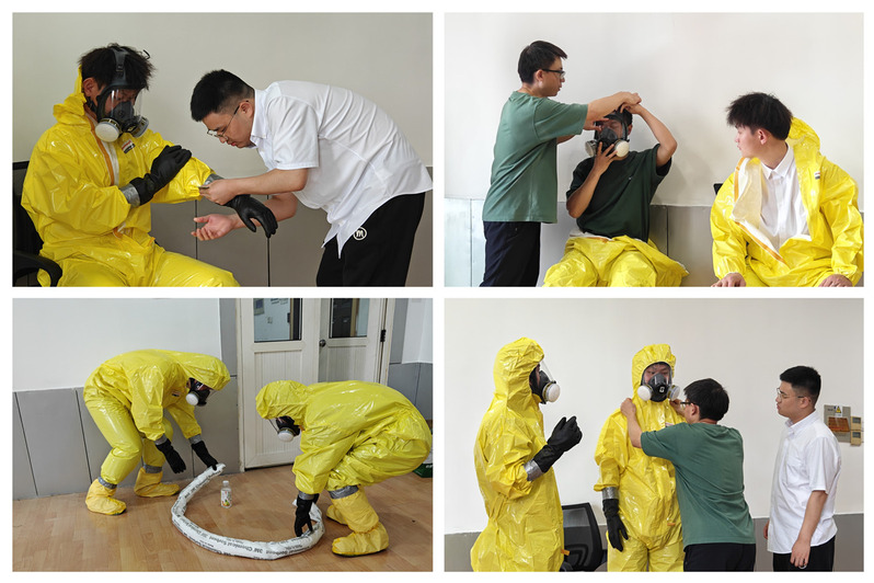 此次安全演练邀请莱博思安全科技马宝意培训师进行指导,以实验室浓硫酸泄漏为例开展应急演练。马宝意阐述了个体防护基本知识、分类和选用原则,讲解了浓硫酸的危险特性及应急措施,指导员工正确穿戴防护面罩、防护服、防化手套等防护用品,并指导员工实操练习如何处置泄漏物质。
