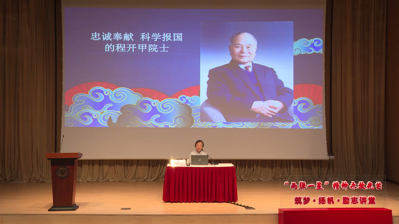 程漱玉以“忠诚奉献科学报国的程开甲院士”为题回忆讲述了程开甲院士为国铸盾,为核武器事业忠诚奉献的一生。谈起父亲程开甲,程漱玉说:“当我聆听他娓娓道来他的成长、成才经历,回忆他坚决听从党的召唤,为国家、民族的利益放弃已有的一切,全身心投入到每一次的转变中,并做出令人惊叹的成绩时,我感受到极大震撼。”程漱玉分别从程开甲的爱国主义精神、一切服从党和国家的需要——程开甲经历的4次重大转变、程开甲对核武器事业的杰出贡献、开拓创新永在路上等4个方面娓娓讲述了父亲程开甲一生走过的“路”。她以2016年99岁的程开甲的题词“发扬求是精神,永攀科学高峰”激励师生勇敢承担科研任务,为国家的强大永不言败。