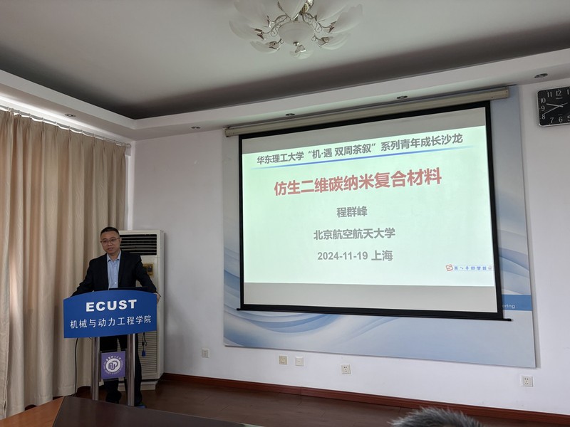 11月19日上午,“机·遇 双周茶叙”系列青年成长沙龙(第二十期)在徐汇校区举行。本次活动邀请了北京航空航天大学化学学院程群峰教授作题为“仿生二维碳纳米复合材料”的学术报告。机动学院副经理白志山、张博威特聘研究员、王涛特聘副研究员、化学与分子工程学院张斌副教授等多位老师以及硕博士研究生参与了本次活动。