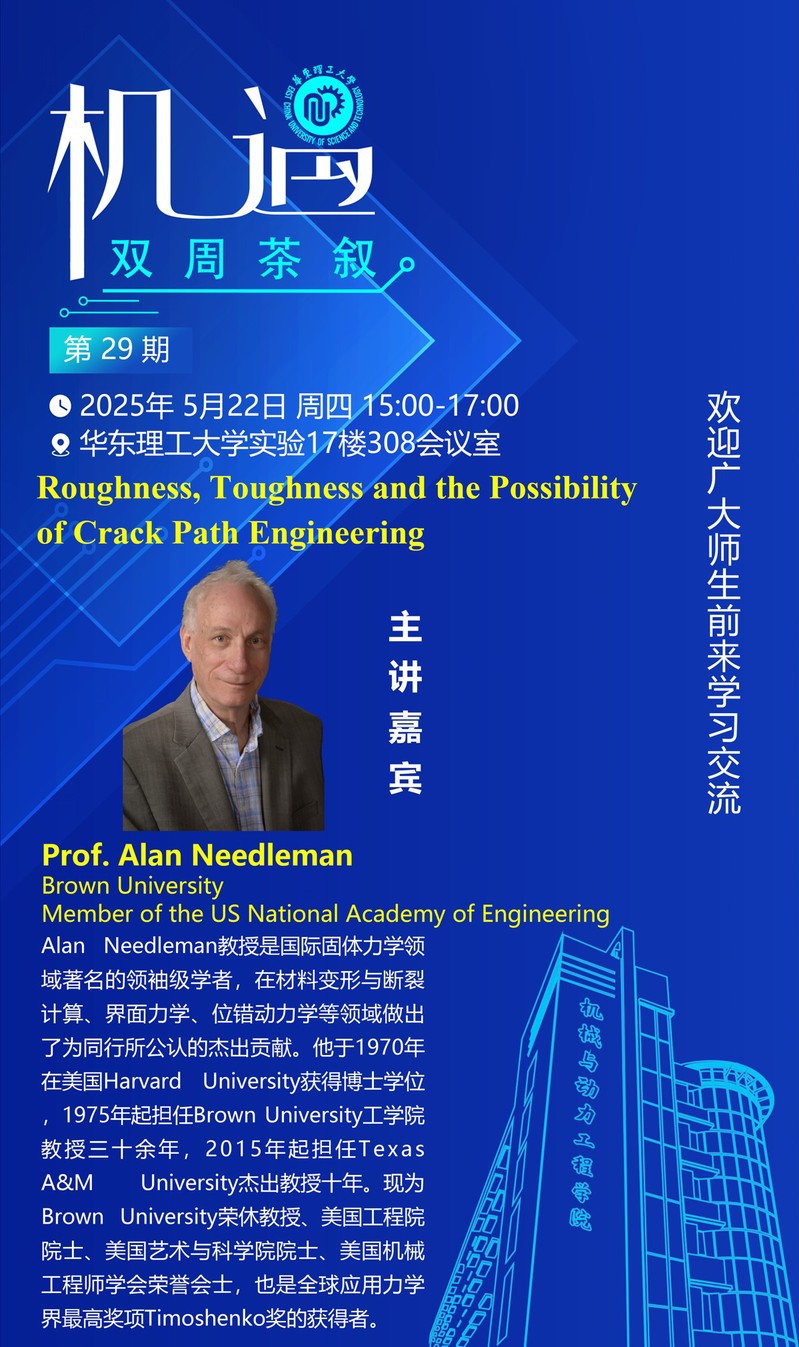 报告人简介:Alan Needleman教授是国际固体力学领域著名的领袖级学者,在材料变形与断裂计算、界面力学、位错动力学等领域做出了为同行所公认的杰出贡献。他于1970年在美国HarvardUniversity获得博士学位,1975年起担任Brown University工学院教授三十余年,2015年起担任Texas A&M University杰出教授十年。现为Brown University荣休教授、美国工程院院士、美国艺术与科学院院士、美国机械工程师学会荣誉会士,也是全球应用力学界最高奖项Timoshenko奖的获得者。