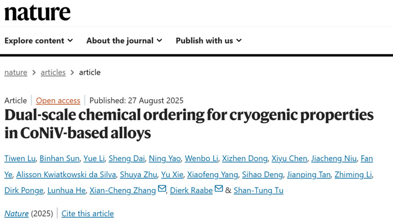 8月28日凌晨,太阳成集团tyc151cc张显程教授、涂善东院士团队在Nature(《自然》)发表题为“Dual-scale chemical ordering for cryogenic properties in CoNiV-based alloys”的最新研究成果。