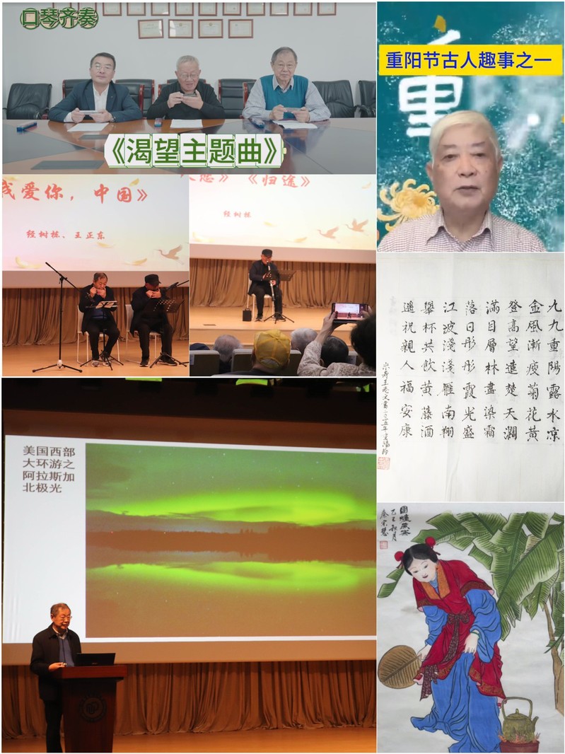 随后,多位退休教师登台展示了他们“退休不褪色、晚年亦芳华”的别样风采。现场既有潘家祯老师制作的趣味短视频《古人的重阳节这样玩》,也有秦宗慧老师笔触细腻、意境清新的工笔画作《仕女、花卉图》。王正东老师以《我的退休10年》为题,分享了退休后“行走天下”的精彩历程——从川西雪山到珠峰银河,从阿拉斯加极光到澳大利亚粉红湖,他用镜头与文字记录山河壮美,用脚步诠释“只要能动,仍想远行”的生命热情。他还介绍了未来十年撰写个人传记、参与院志编撰等计划,展现了退休教师退而不休、持续发光的精神风貌。在音乐环节,经树栋、王正东、安琦三位老师以口琴奏响《渴望》《我的祖国》等时代旋律,并现场合奏《我爱你,中国》;经树栋老师还演绎了电吹管曲目《秋恋》《归途》,将传统器乐与现代电子音效巧妙融合,悠扬旋律中饱含深情,引来全场阵阵掌声。