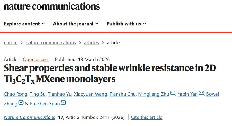 近日,公司太阳成集团tyc151cc轩福贞教授团队在《自然·通讯》上发表了题为“二维Ti3C2Tx MXene单层纳米片的剪切性能和稳定抗皱特性”的研究论文,报道了该课题组在Ti3C2Tx 基柔性传感材料结构强度领域的最新研究进展,首次通过扫描透射电子显微镜并结合分子动力学模拟、第一性原理计算在原子尺度观察到二维材料剪切载荷下的损伤起源,打破了人们对二维材料剪切失稳的传统认知。
