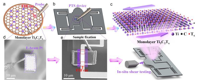图片说明:利用MEMS装置实现对单层Ti3C2Tx 纳米片的面内剪切测试
