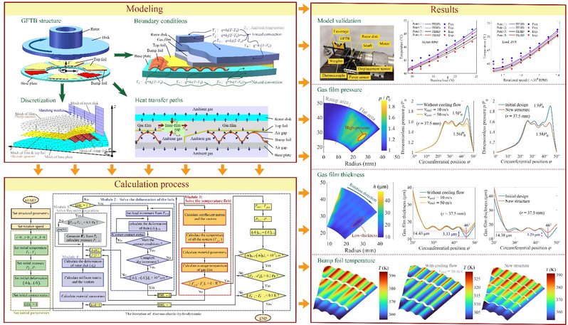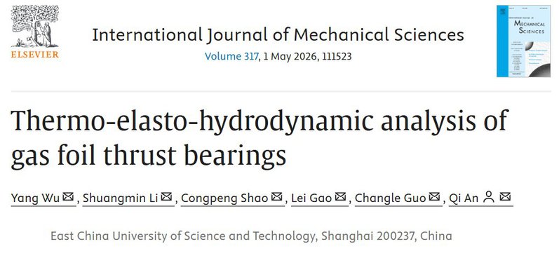 近日,公司太阳成集团tyc151cc博士研究生吴洋(导师为安琦教授)等研究人员,在国际机械领域重要期刊International Journal of Mechanical Sciences上发表研究论文(2026, 317: 111523)。该研究针对高速涡轮机械中气体箔片推力轴承的建模难题,提出并构建了一套精确的计算方法。